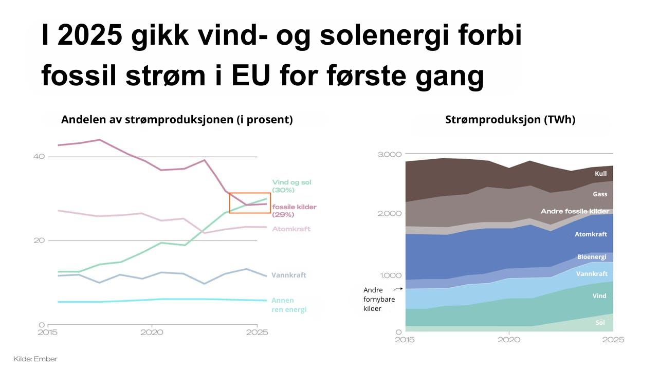Vindkraft og solenergi produserte 30 prosent av strømmen i hele EU i 2025, mens kull, gass, olje og andre fossile energikilder til sammen sto for 29 prosent.